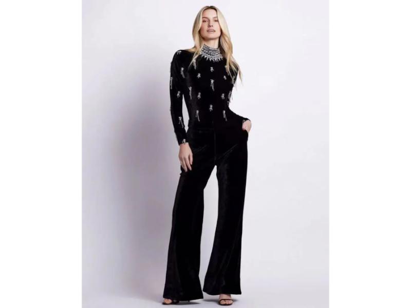 Πολυτελής βελούδινη ολόσωμη φόρμα με μακρύ μανίκι κεντητές λεπτομέρειες και λαμπερή διακόσμηση στον γιακά για statement βραδινές εμφανίσεις