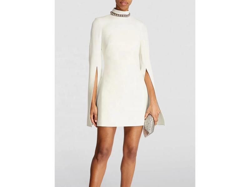 Λευκό mini φόρεμα με ενσωματωμένη κάπα και ψηλό λαιμό διακοσμημένο με στρας που προσφέρει μια elegant και classy εμφάνιση ιδανική για βραδινές εξόδους
