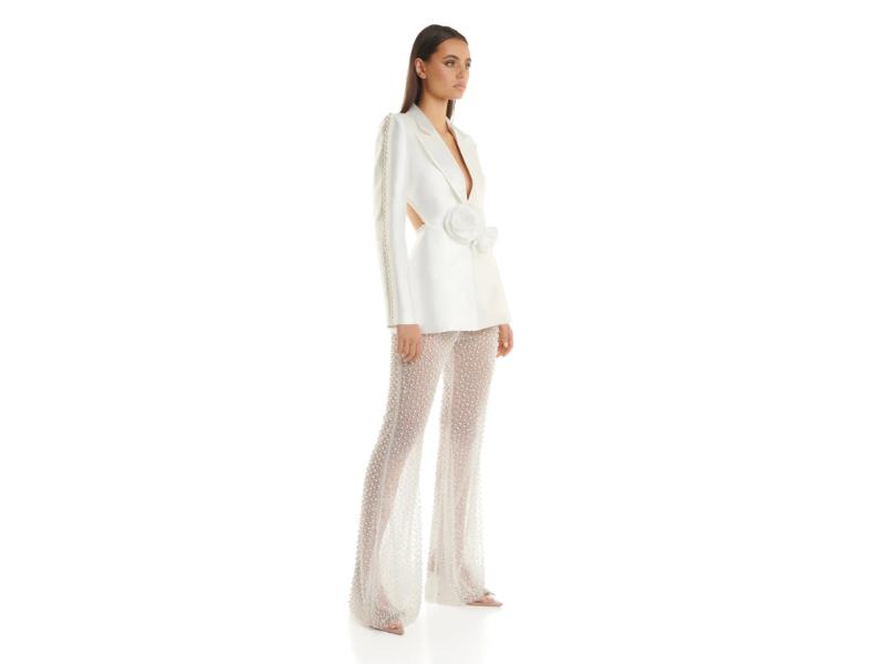 Εντυπωσιακό λευκό σατέν κοστούμι με πολυτελείς λεπτομέρειες από πέρλες στα μανίκια και διάφανο παντελόνι διακοσμημένο με πέρλες. Η λουλουδένια ζώνη στη μέση προσθέτει θηλυκότητα και κομψότητα ιδανικό για μοναδικές εμφανίσεις που ξεχωρίζουν.