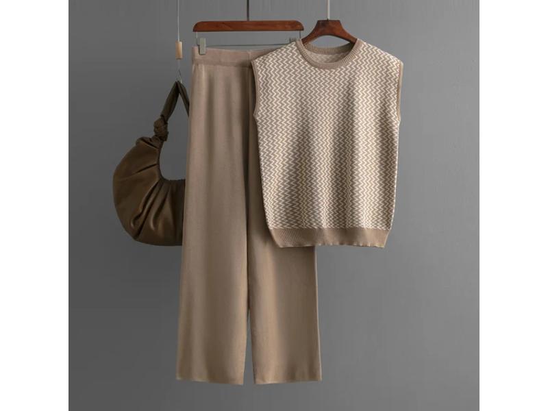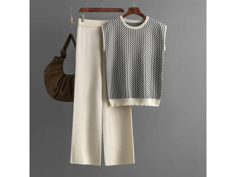 Μοντέρνο πλεκτό σετ με αμάνικο τοπ σε ζικ ζακ σχέδιο και παντελόνα για άνεση και κομψότητα στις καθημερινές εμφανίσεις.